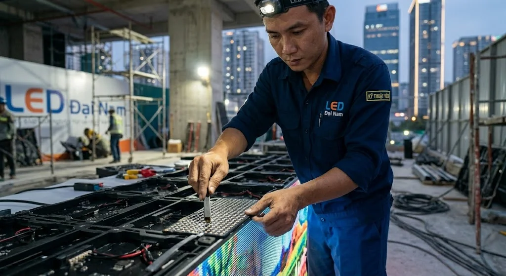 Điểm chết thường do va chạm vật lý hoặc tĩnh điện khi vệ sinh không đúng cách. Tại LED Đại Nam, chúng tôi tặng kèm module dự phòng và hướng dẫn nhân viên của Anh/Chị cách thay thế tấm module lỗi bằng dụng cụ hút nam châm chỉ trong 30 giây.
