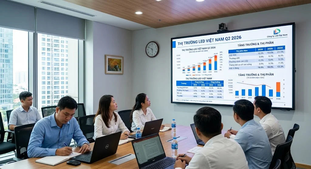 Nhiều Anh/Chị lo lắng về chi phí vận hành. Theo thực tế đo đạc tại các dự án 2025, một màn hình LED P2 diện tích 6m2 tiêu thụ trung bình 1.5 – 2.2 số điện mỗi giờ họp (tương đương 1 máy lạnh 2HP). Để đảm bảo an toàn, Công ty LED Đại Nam luôn yêu cầu tách biệt nguồn điện màn hình khỏi hệ thống máy tính văn phòng để tránh hiện tượng sụt áp khi bật màn hình lớn.
