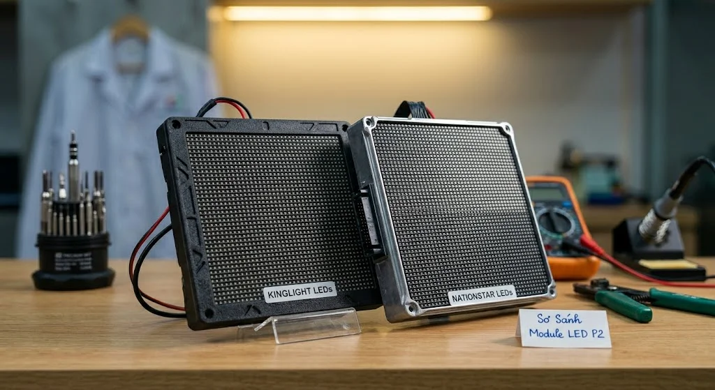 Tôi biết Anh/Chị khi đi tham khảo giá thường thắc mắc tại sao cùng một mã P2 mà mỗi đơn vị lại báo giá chênh lệch nhau vài triệu đồng. Thực tế, giá trị của một màn hình LED nằm ở “nội tạng” bên trong mà mắt thường khó phân biệt được khi mới lắp đặt.