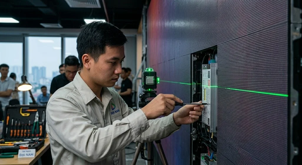 Đặc biệt, việc hoàn thiện thẩm mỹ cũng được chú trọng bằng viền Alu hoặc gỗ mdf chống ẩm, che đi phần khung kỹ thuật dày khoảng 10cm – 15cm. Theo tiêu chuẩn thi công tại Đại Nam, chúng tôi sử dụng máy cân bằng Laser 12 tia để xác định độ phẳng bề mặt khung với sai số dưới 0.5mm. Độ phẳng tuyệt đối là yếu tố tiên quyết để các module P2 không bị khớp, lồi lõm gây mất thẩm mỹ khi bật ánh sáng trắng.