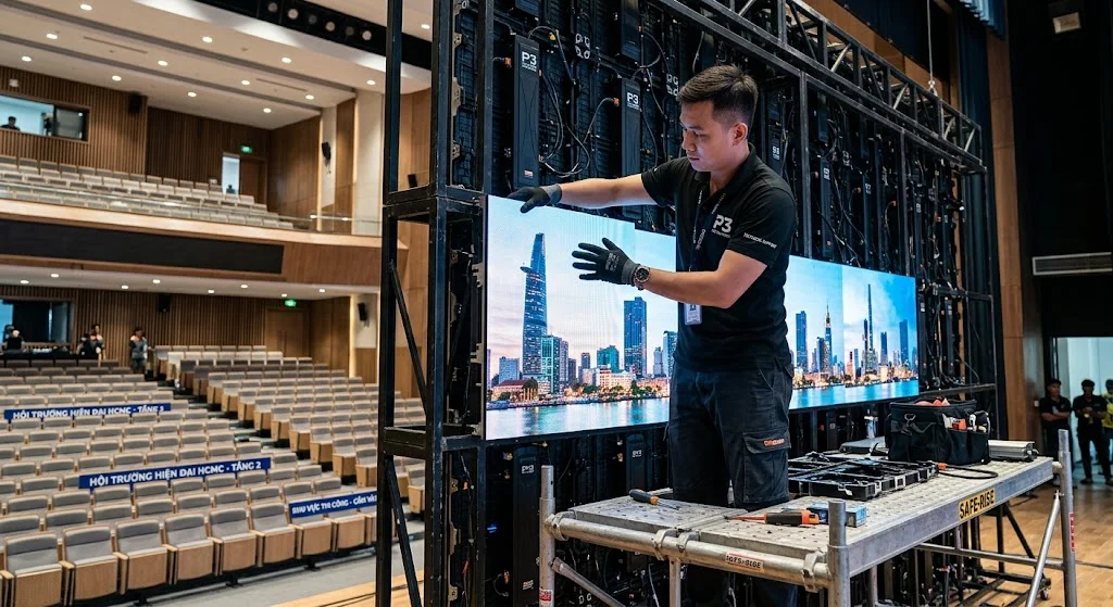 Kỹ thuật viên LED Đại Nam đang thi công lắp đặt màn hình LED P3 tại công trình