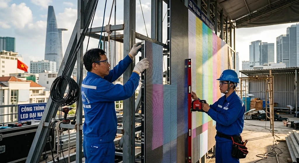 Tại LED Đại Nam, chúng tôi thực hiện quy trình thi công 5 bước tiêu chuẩn giúp rút ngắn 30% thời gian lắp đặt và đảm bảo tính thẩm mỹ phẳng tuyệt đối cho công trình.