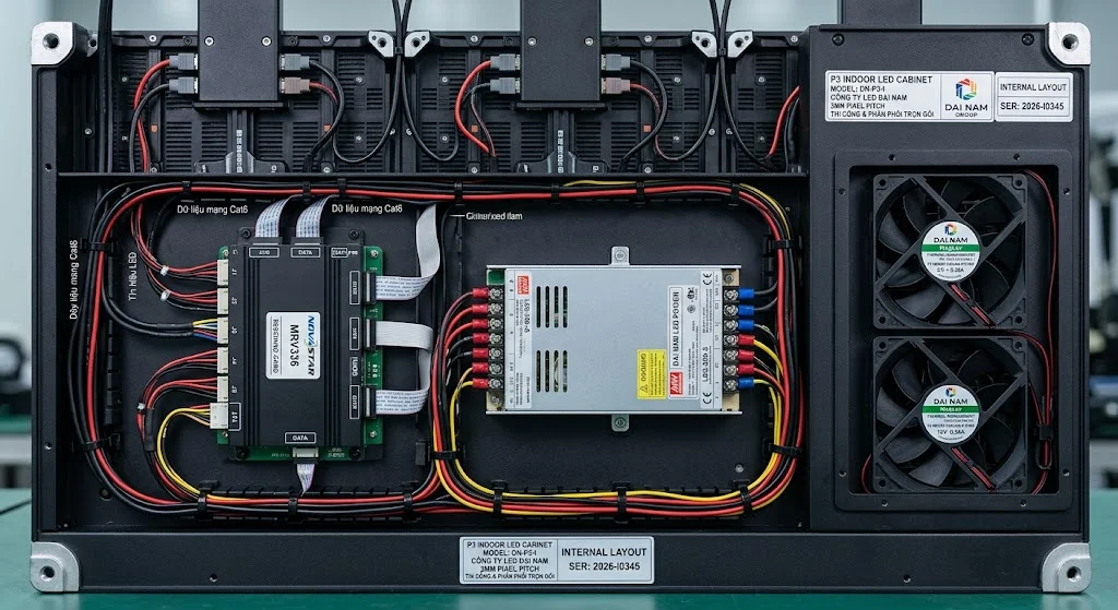 Đây là nội dung mà ít đơn vị đề cập sâu nhưng lại là nguyên nhân chính dẫn đến hỏng hóc. Khi lắp âm vào vách gỗ hoặc thạch cao, màn hình LED tỏa ra nhiệt lượng khoảng 40-50 độ C khi hoạt động liên tục. Nếu không có không gian thoát nhiệt, nhiệt độ tích tụ sẽ làm giảm tuổi thọ bóng LED và card điều khiển rất nhanh. Tại LED Đại Nam, tôi luôn tư vấn thiết kế khung sắt cách tường tối thiểu 100mm và bố trí hệ thống quạt hút đẩy khí nóng lên trần hoặc ra ngoài.
