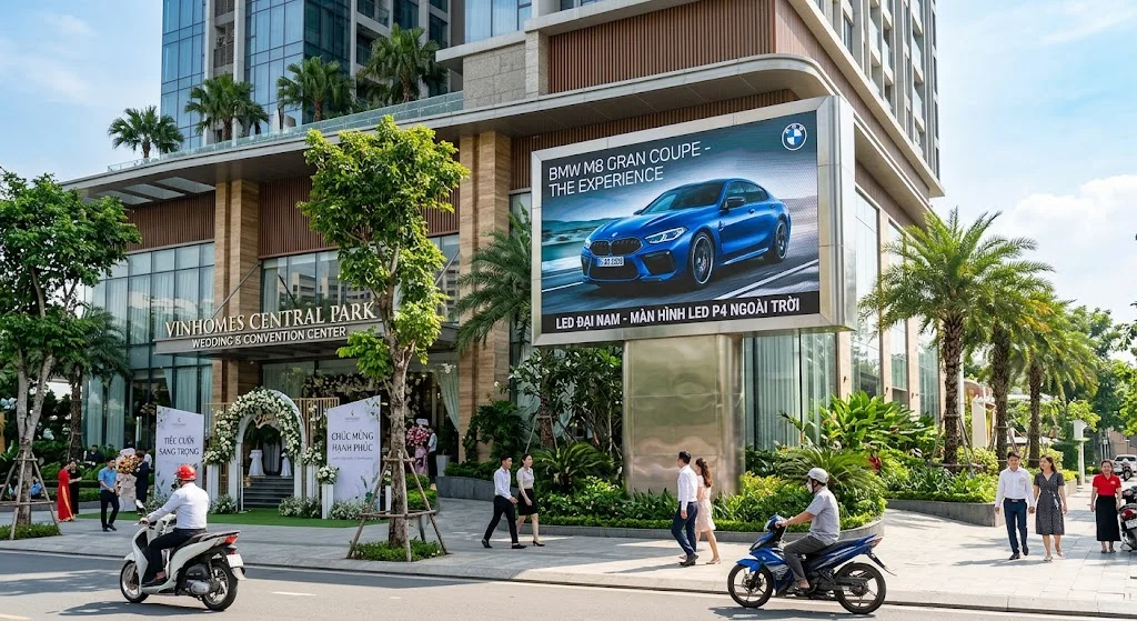 Màn hình LED P4 ngoài trời hiển thị sắc nét dưới ánh nắng trực tiếp tại trung tâm sự kiện.