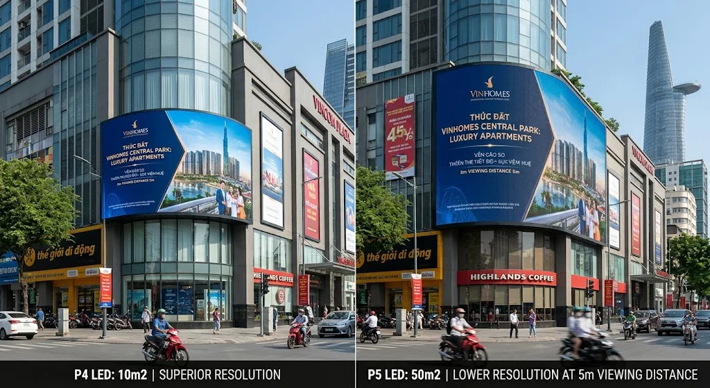 Việc lựa chọn giữa P4 và P5 phụ thuộc vào khoảng cách nhìn tối thiểu 4m và diện tích màn hình trên 15m2 để cân bằng giữa chi phí và độ nét.