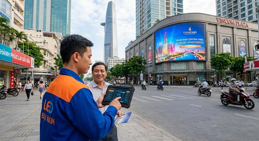 Kỹ thuật viên LED Đại Nam đang tư vấn và vận hành màn hình LED P4 ngoài trời cho khách hàng.