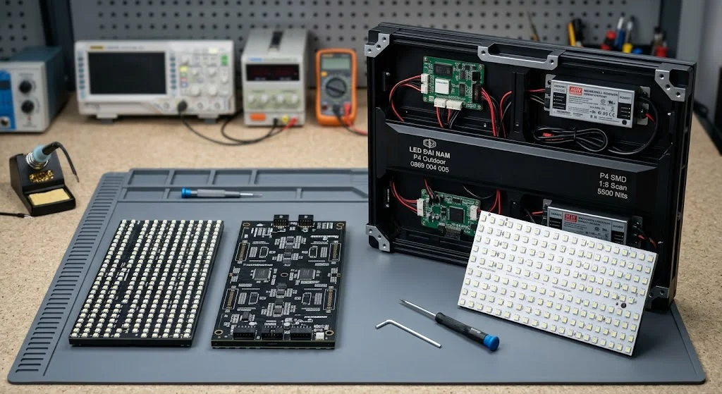 Nhiều khách hàng tại LED Đại Nam thường lo lắng về việc hỏng hóc sau khi bàn giao. Vì vậy, tôi luôn khuyến khích Anh/Chị tham gia vào bước nghiệm thu kỹ thuật để trực tiếp kiểm chứng chất lượng linh kiện và độ hoàn thiện của khung vỏ ốp Alu bao quanh.