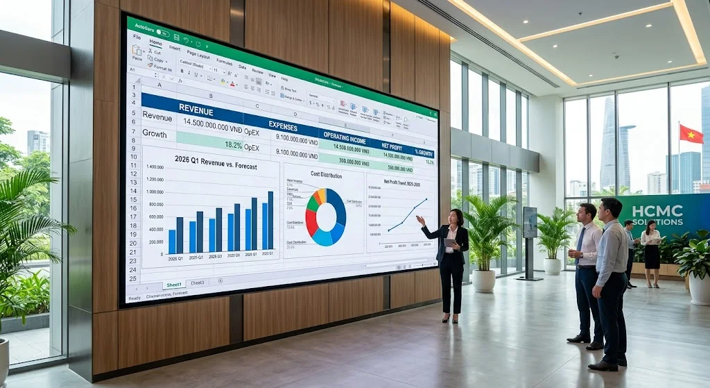 Kinh nghiệm thực chiến: Khi trình chiếu các file số liệu Excel phức tạp, Anh/Chị nên ưu tiên dòng P2 hoặc P2.5. Các dòng P3 trở lên có khoảng cách điểm ảnh lớn, dễ khiến các con số nhỏ bị nhòe, gây mỏi mắt cho người xem ở cự ly gần dưới 3 mét.