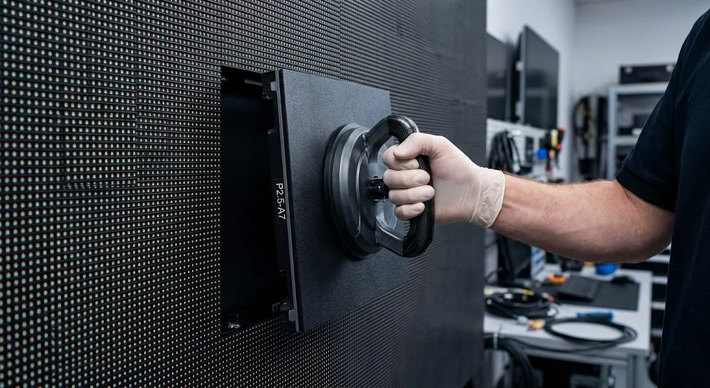 Không cần thay cả màn hình; kỹ thuật viên chỉ cần thay lẻ module bị lỗi bằng công cụ hít nam châm chuyên dụng trong 30 giây, giúp tiết kiệm chi phí và đảm bảo tính liên tục cho sự kiện.