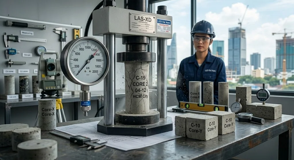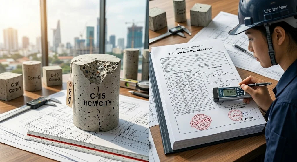 Chủ đầu tư cần đối soát mã số LAS-XD, cường độ nén mẫu thực tế (R28) và kết luận an toàn để xác định chất lượng công trình đạt chuẩn.