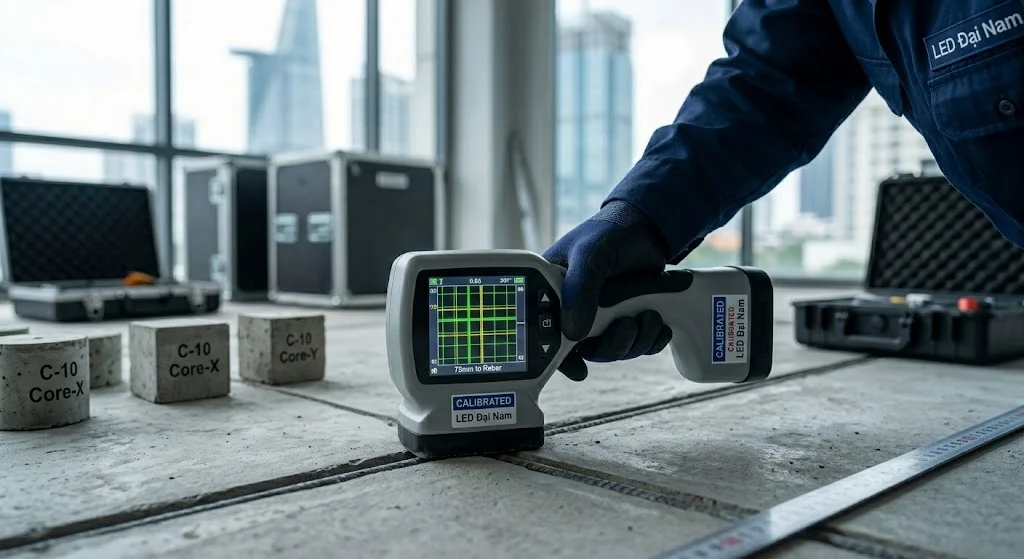 Từ kinh nghiệm triển khai dự án cho các tòa nhà văn phòng, tôi thấy rằng uy tín không chỉ nằm ở tờ giấy chứng chỉ mà còn ở độ chính xác của thiết bị. Ví dụ, máy siêu âm radar quét cốt thép hiện đại có thể xác định vị trí thép trong bê tông với độ sâu lên tới 150mm – nghĩa là xác định đúng 99% vị trí thép để tránh khoan trúng khi lắp đặt màn hình LED nặng.